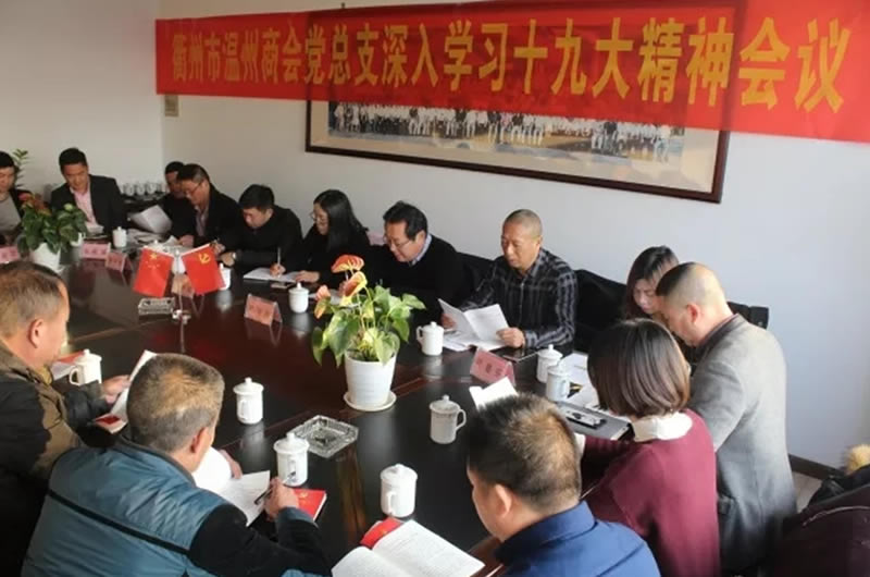衢州市温州商会于2008年6月建立党支部,2010年5月党支部升格为党总支部,隶属于衢州市社会组织联合会党委。现有3个支部,有党员36名,流动党员5名。其中温州商会第一党支部于2008年7月成立,共有党员25人,预备党员1名;万电电气有限公司党支部于2010年8月成立,共有党员4名;衢州塔底水利枢纽有限公司党支部于2010年12月成立,共有党员7名。党组织成立后主要在会员企业党组织发展;党组织规范化建设;开展革命传统教育;引导会员行社会责任;助推商会健康发展等五个方面做工作,并取得了成效。 2011年度新社会组织“创先争优”先进党组织、衢州市2012至2013年度学习型党组织建设先进单位、2014年度全市工商联系统党建工作先进商会、2015年度全市工商联系统党建工作先进商会等…