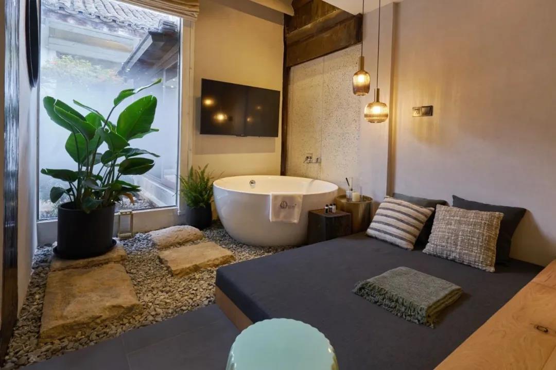 其中,“色宽”、“扯空”、发靥”房型,还有超大户外圆形泡池浴缸,在市区也能体验一把“野奢感”。千年运河的袅袅水声伴随着历史底蕴静谧和繁华自由切换在这里自由切换,真真有种大隐隐于市的感觉。