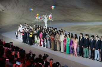 2017年,皮尔•卡丹再一次选择了同在西部地区的甘肃省黄河石林国家地质公园,作为其2017年春夏时装发布的地点。9月19日下午,遥望远处灰黄色的石林峭壁,在黄河畔准备前往秀场的来宾们按捺心情,辗转乘坐羊皮筏子再换乘驴车通往发布现场,这样的入场让人感叹罕见的同时,更是将浓浓的西部风情深深的印刻在人们的心中。这片粗犷的天与地回荡着古朴的纯粹和自然的呐喊,这也预示着这样一场以“纯”为主题的秀,必将是用最“野”的方式来演绎内心动人的欢歌。
